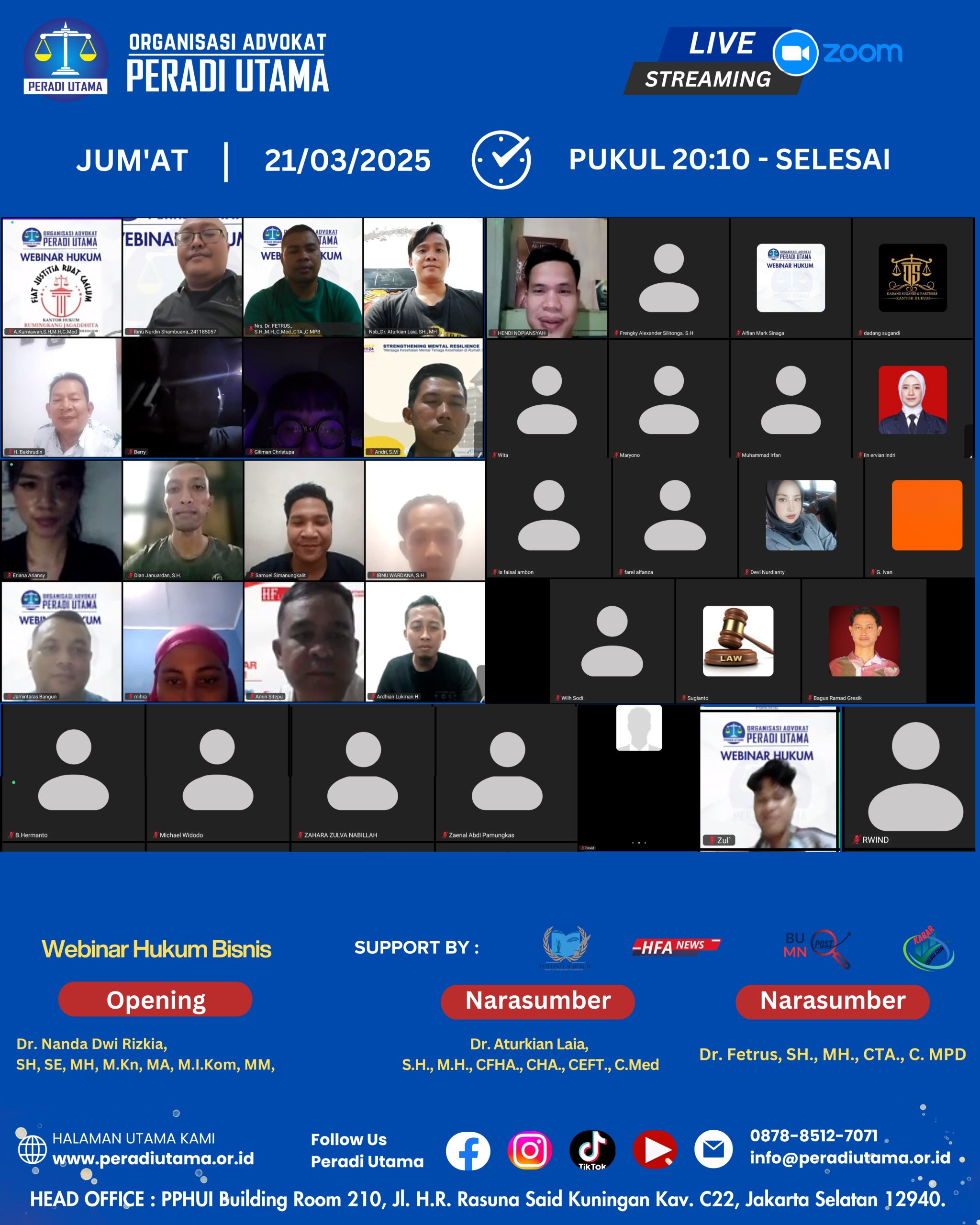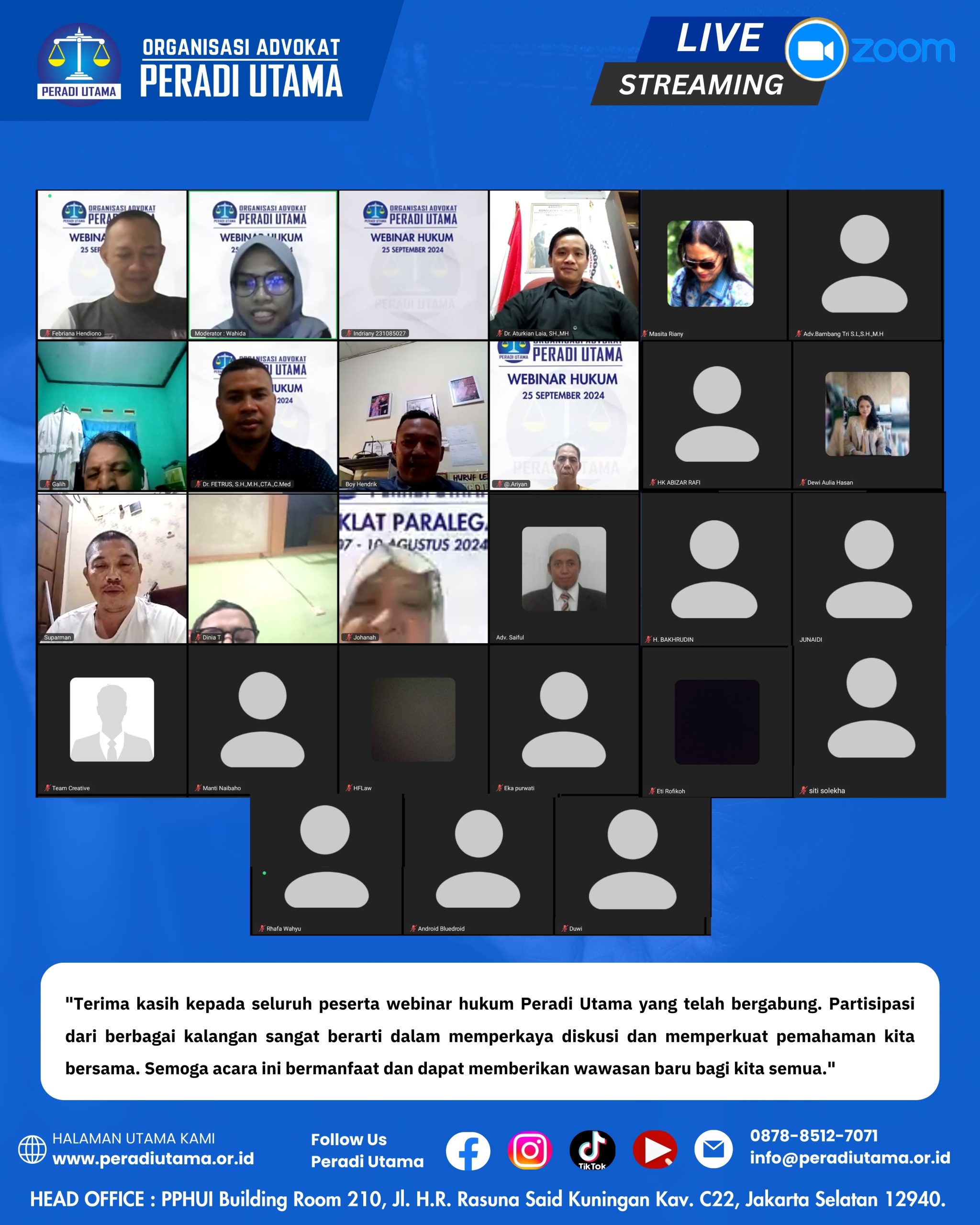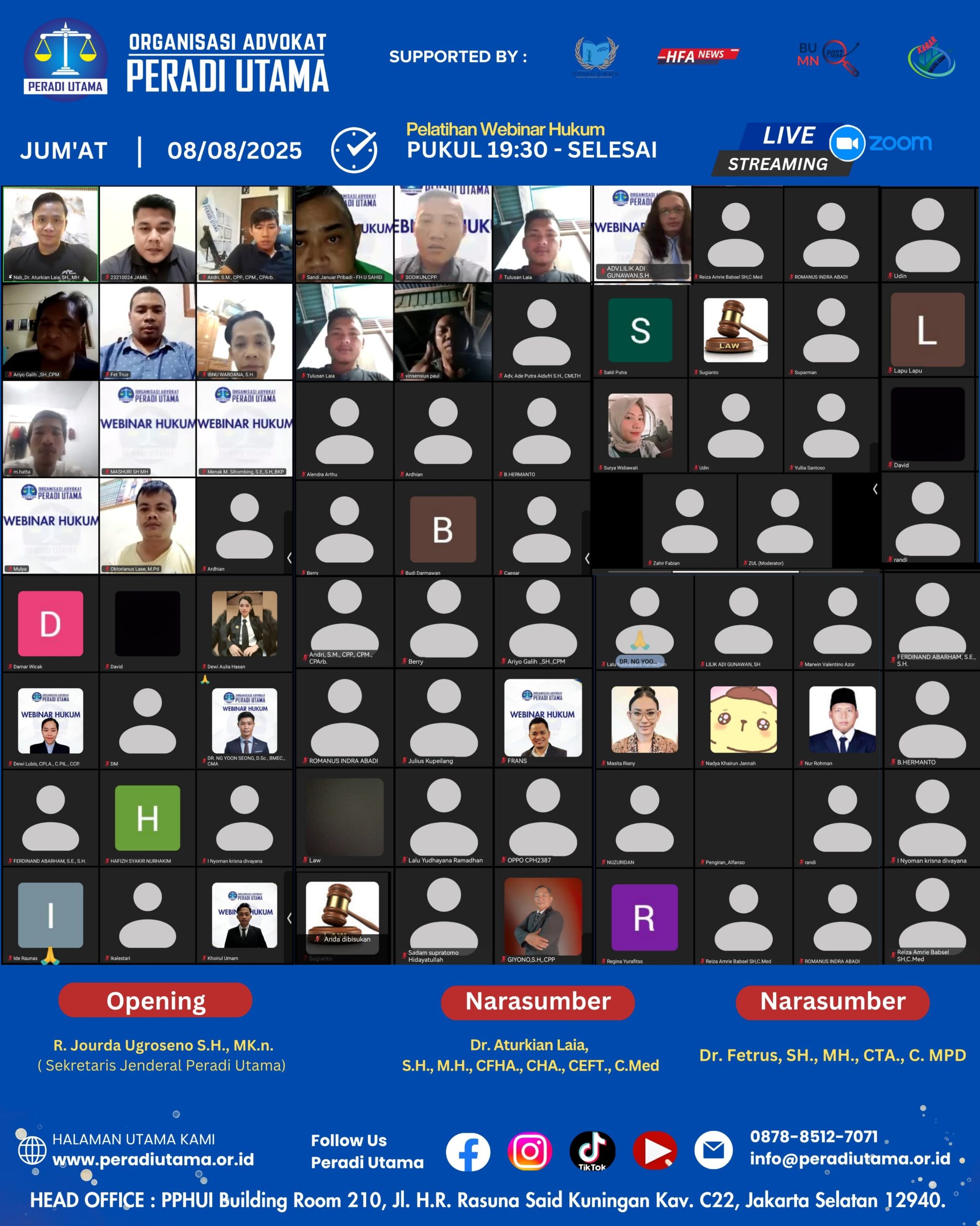PERADIUTAMA.COM – Jakarta, 8 Agustus 2025 — Organisasi Advokat PERADI UTAMA sukses menyelenggarakan webinar hukum nasional bertajuk “Analisis Kasus Hasto & Tom Lembong: Hukum Tajam ke Bawah, Kasus Segede Gajah Lewat – Di Mana Integritas Penegak Hukum”. Acara yang digelar secara daring ini terbuka untuk masyarakat luas dan berhasil menarik