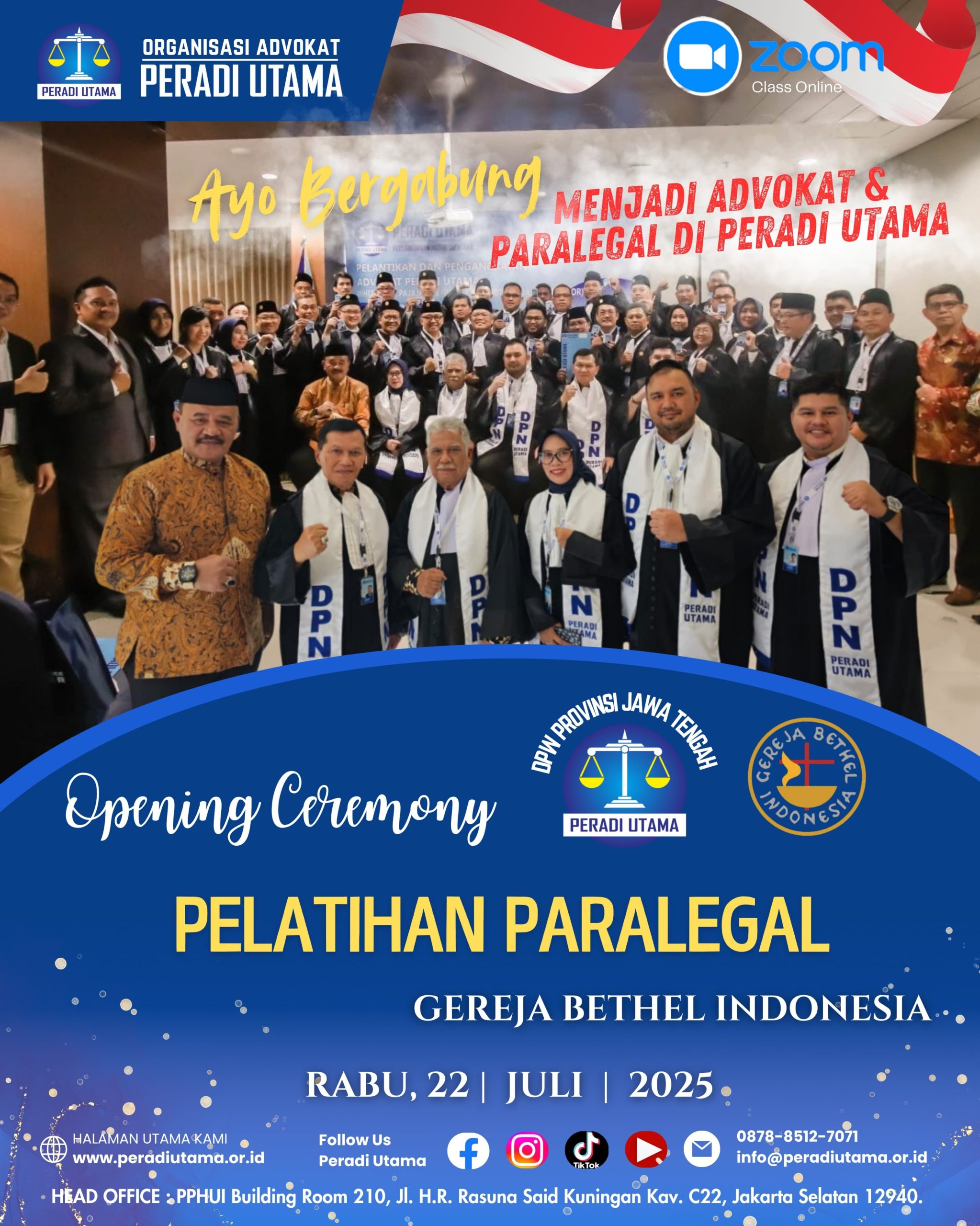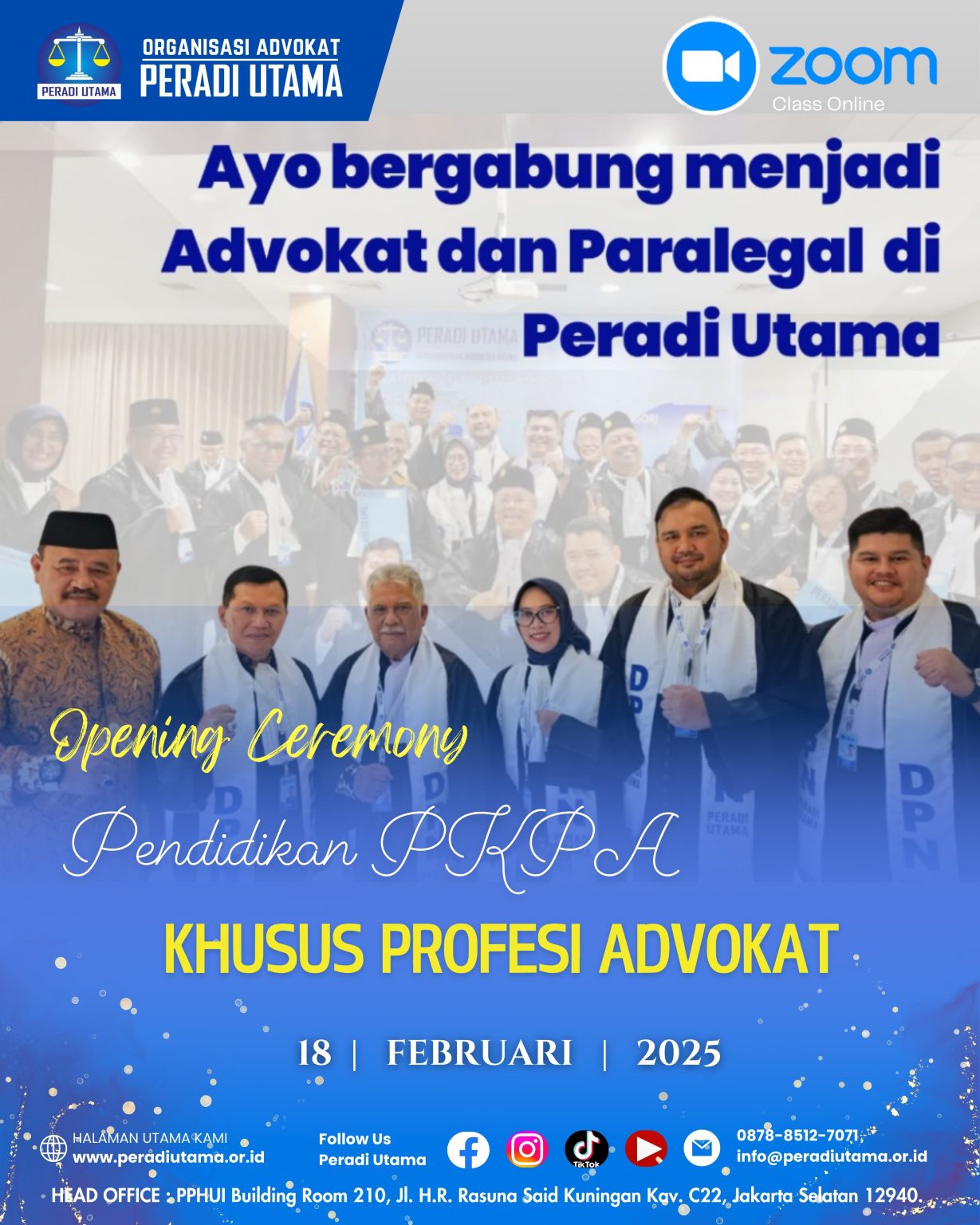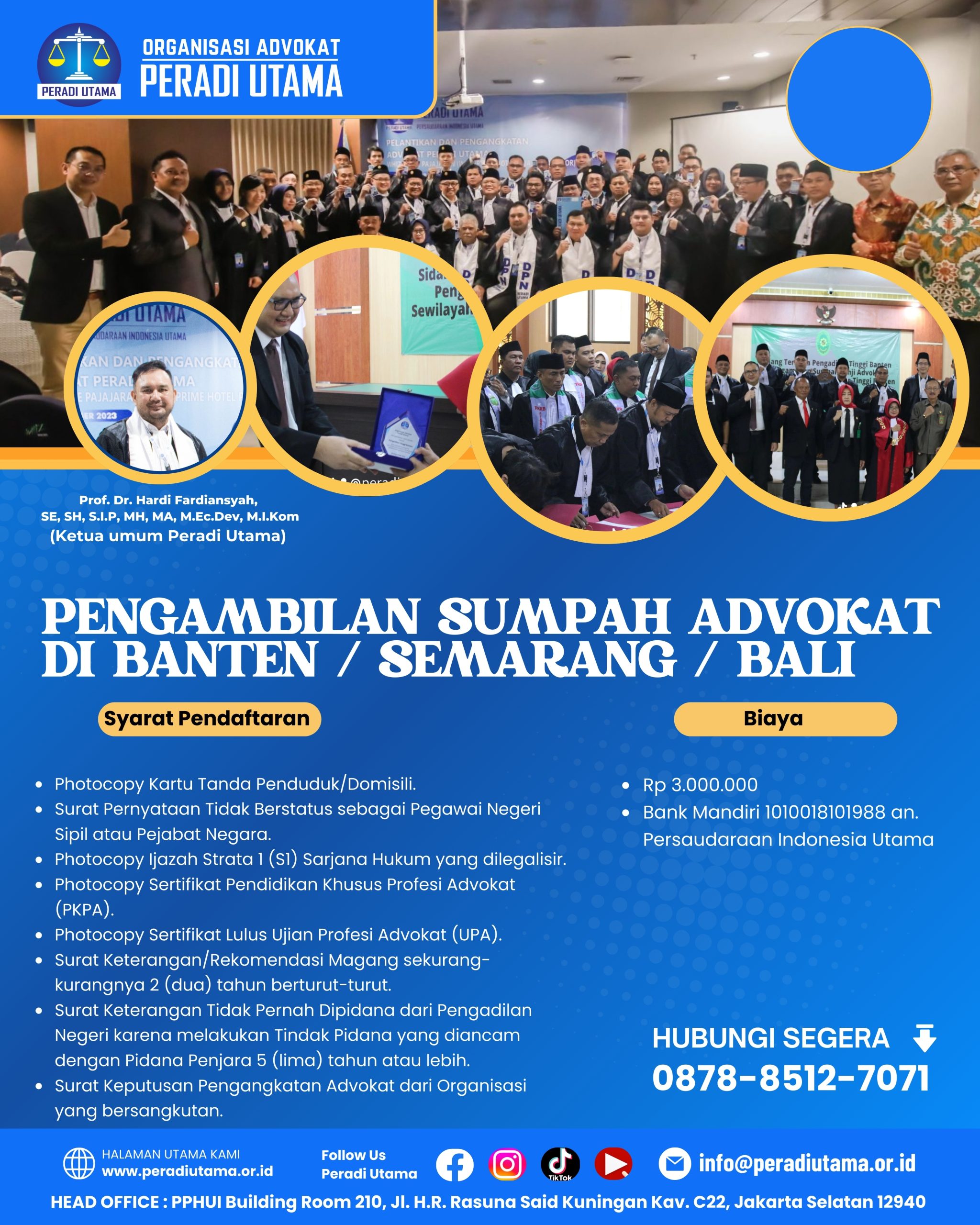 Peradi Utama adalah organisasi advokat terpercaya di Indonesia yang berdedikasi menegakkan keadilan, melindungi hak asasi manusia, serta memajukan profesi hukum melalui pendidikan, sertifikasi, dan layanan bantuan hukum. Dengan program unggulan seperti PKPA, UPA, pelantikan dan sumpah advokat di Pengadilan Tinggi, serta pendidikan paralegal, kami hadir sebagai mitra profesional yang memastikan setiap langkah calon advokat dan paralegal berjalan resmi, sah, dan berintegritas. Didukung jaringan luas di seluruh Indonesia, Peradi Utama berkomitmen mencetak sumber daya hukum yang unggul demi tercapainya sistem hukum yang adil, transparan, dan berkelanjutan.