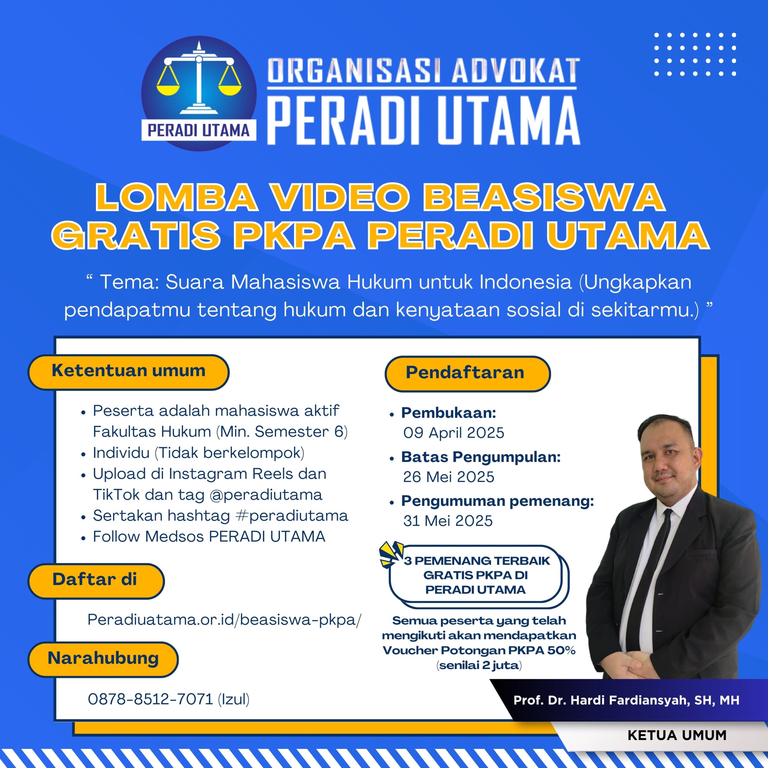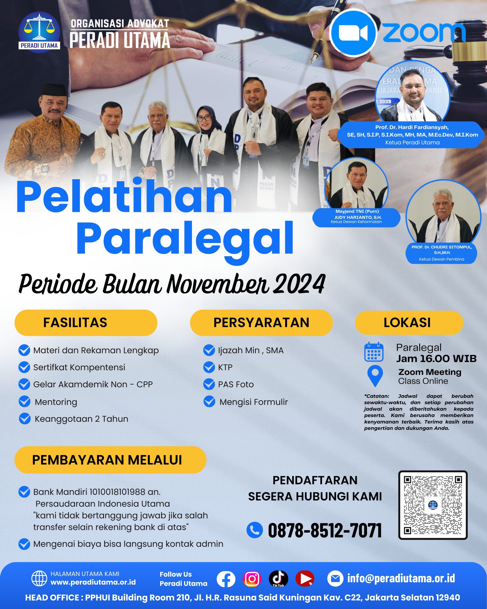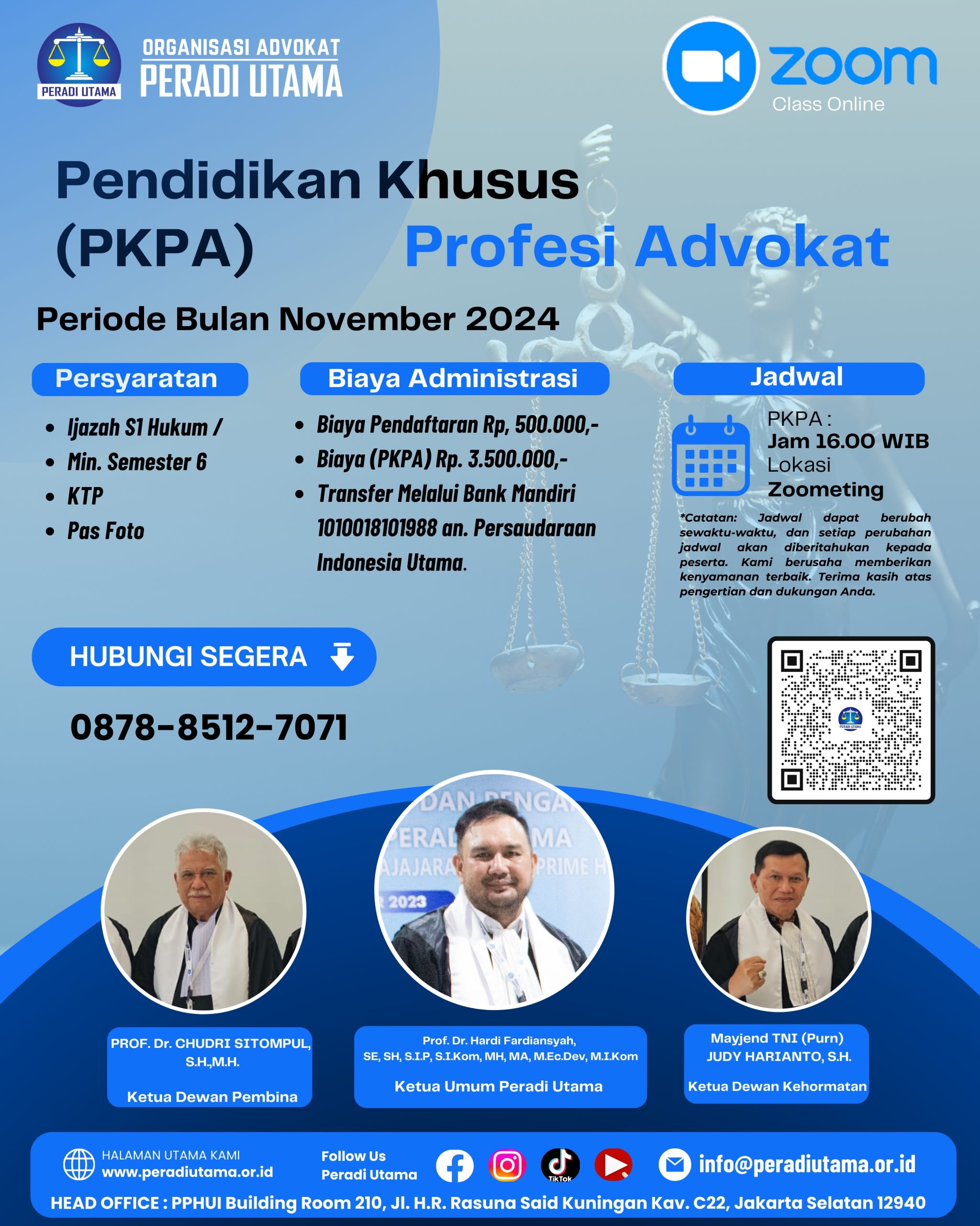 Peradi Utama adalah organisasi advokat terpercaya di Indonesia yang berdedikasi menegakkan keadilan, melindungi hak asasi manusia, serta memajukan profesi hukum melalui pendidikan, sertifikasi, dan layanan bantuan hukum. Dengan program unggulan seperti PKPA, UPA, pelantikan dan sumpah advokat di Pengadilan Tinggi, serta pendidikan paralegal, kami hadir sebagai mitra profesional yang memastikan setiap langkah calon advokat dan paralegal berjalan resmi, sah, dan berintegritas. Didukung jaringan luas di seluruh Indonesia, Peradi Utama berkomitmen mencetak sumber daya hukum yang unggul demi tercapainya sistem hukum yang adil, transparan, dan berkelanjutan.