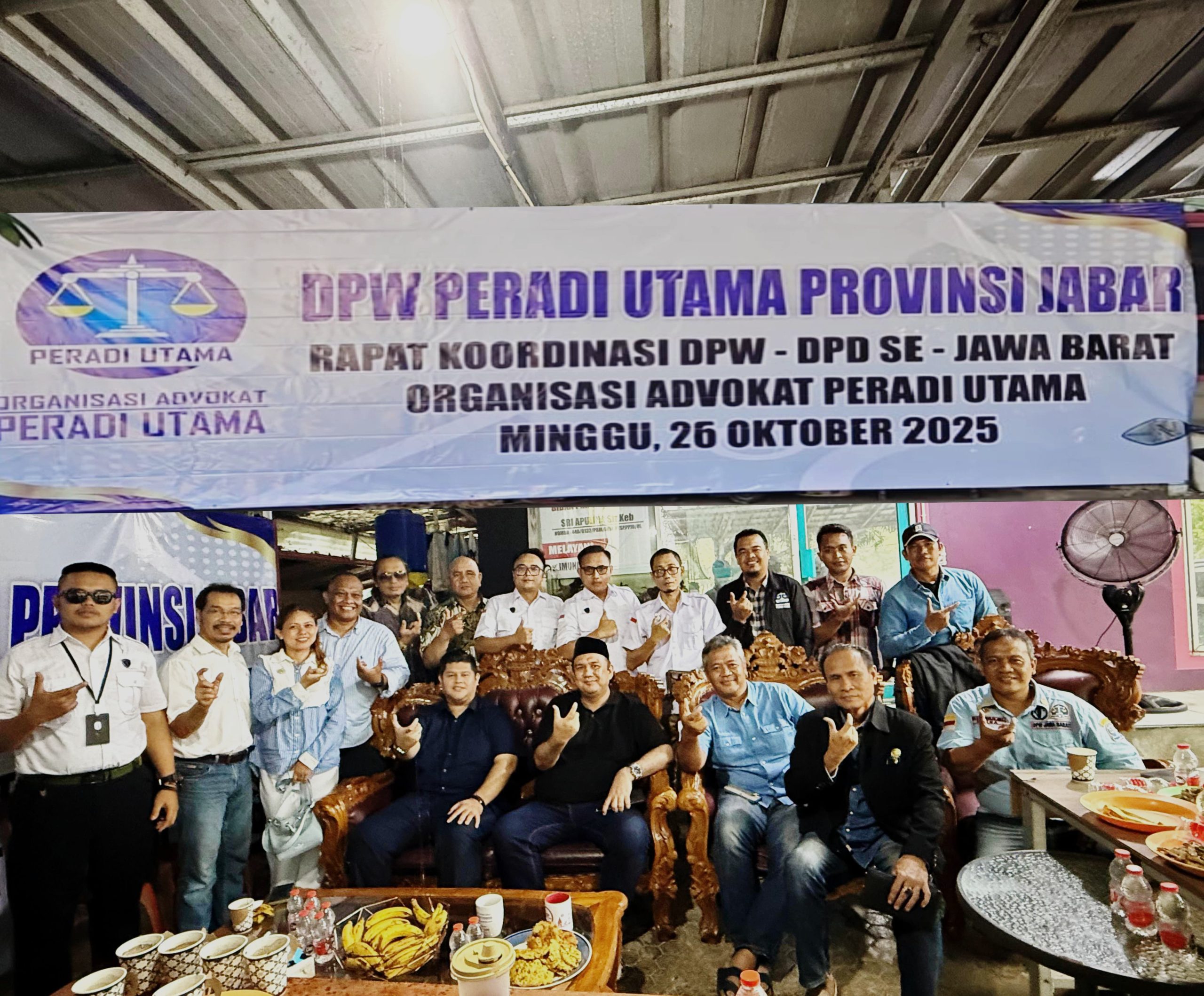 26 Oktober 2025 — Organisasi advokat Peradi Utama sukses menyelenggarakan rapat koordinasi DPW dan DPD se-Jawa Barat pada Minggu, 26 Oktober 2025. Kegiatan ini menjadi momentum penting dalam memperkuat sinergi, soliditas, dan arah kebijakan organisasi di tingkat wilayah dan daerah. Rapat yang dihadiri oleh para ketua, sekretaris, dan pengurus DPW