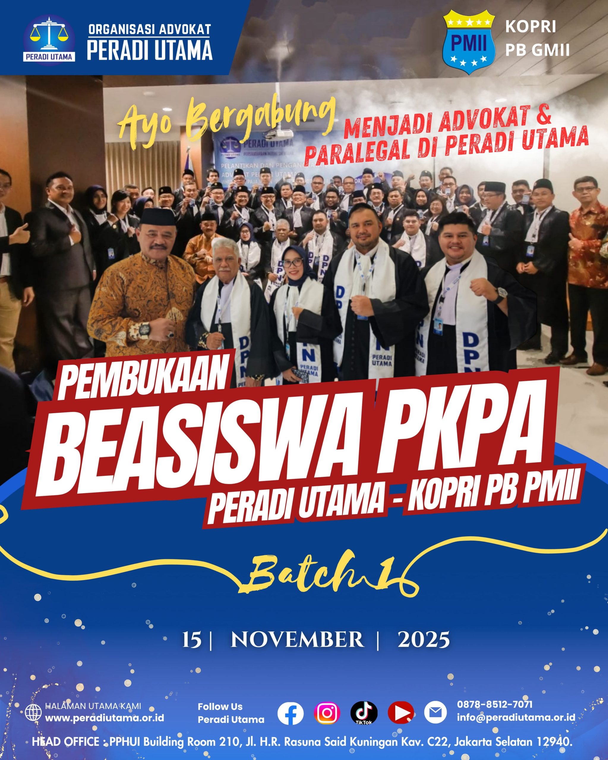 Sabtu, 15 November 2025 — Program Beasiswa Pendidikan Khusus Profesi Advokat (PKPA) PERADI Utama bekerja sama dengan KOPRI PB PMII resmi dibuka. Inisiatif ini menjadi langkah strategis dalam mempercepat hadirnya kader-kader perempuan yang siap terjun ke dunia advokasi dengan bekal nilai, etika, serta keberanian moral yang kuat. Program beasiswa ini