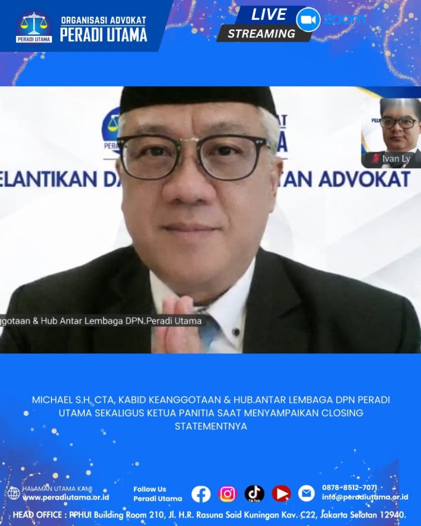 Selain itu, Michael S.H, CTA, Kabid Keanggotaan & Hub.Antar Lembaga DPN Peradi Utama sekaligus Ketua Panitia pada closing statementnya menyampaikan ucapan selamat kepada advokat yang baru saja dilantik.
